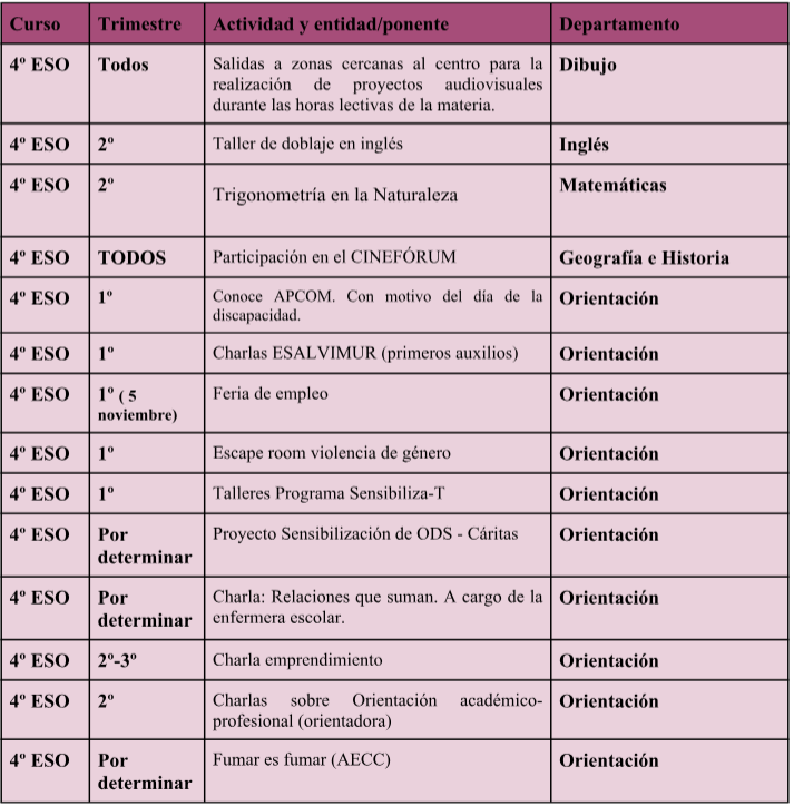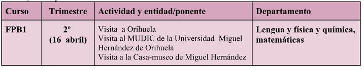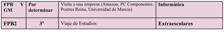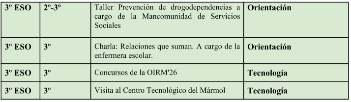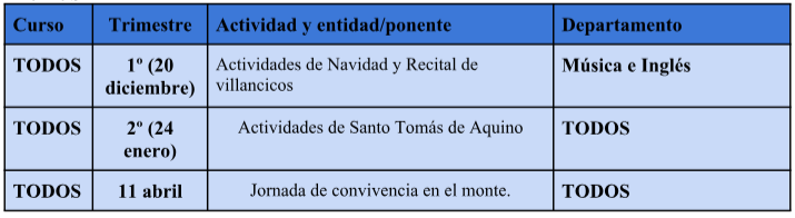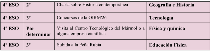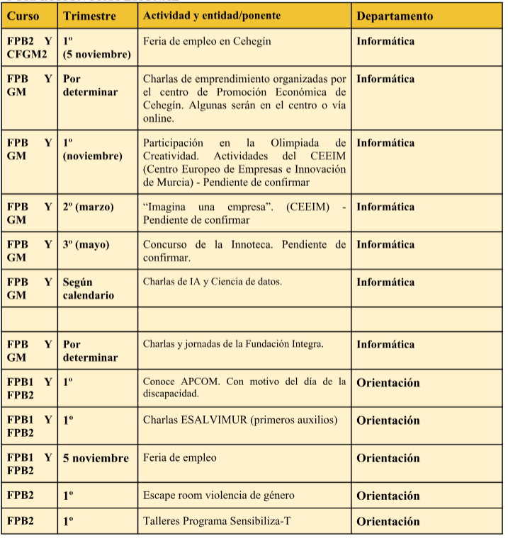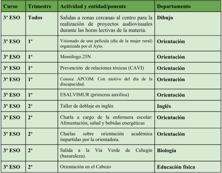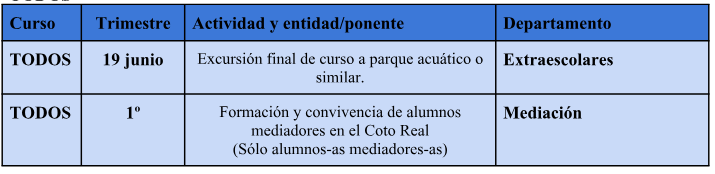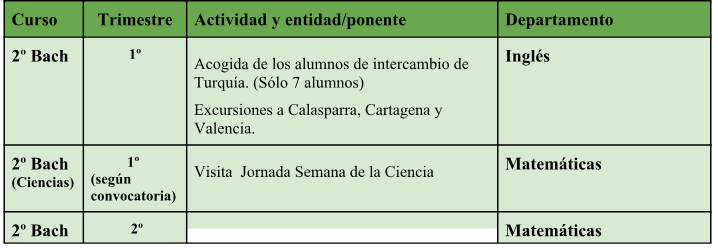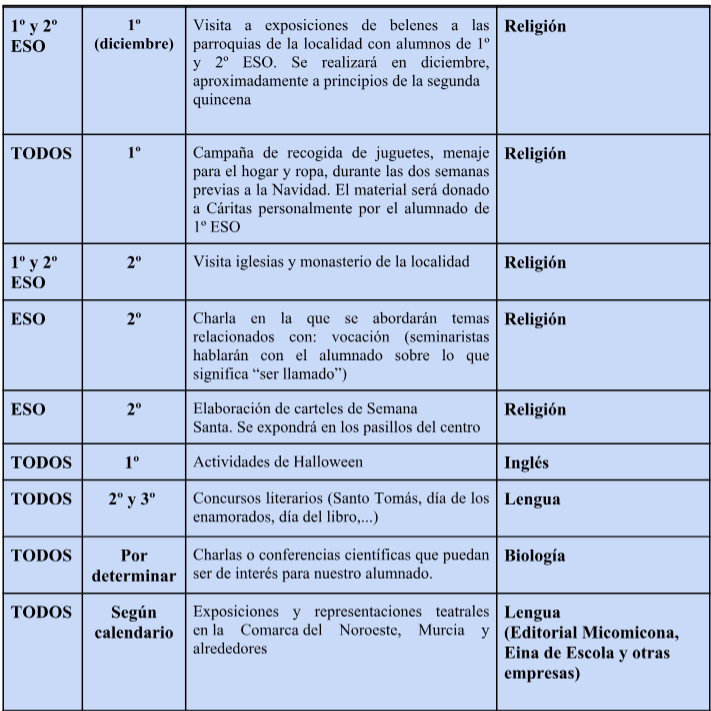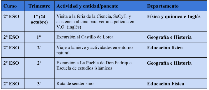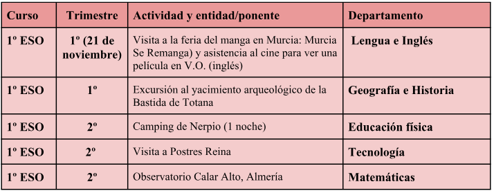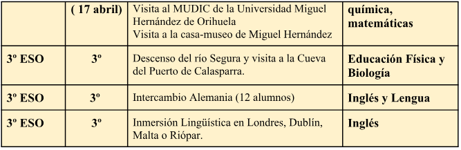 Actividades  que conllevan pérdida de clase, debido a que son actividades que, como mínimo, necesitan de  una mañana completa para su realización.